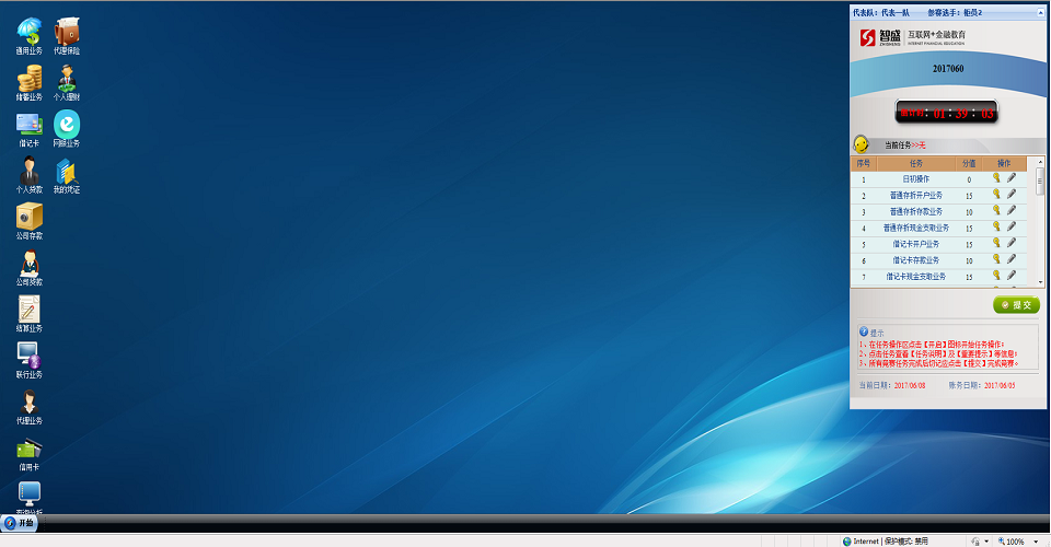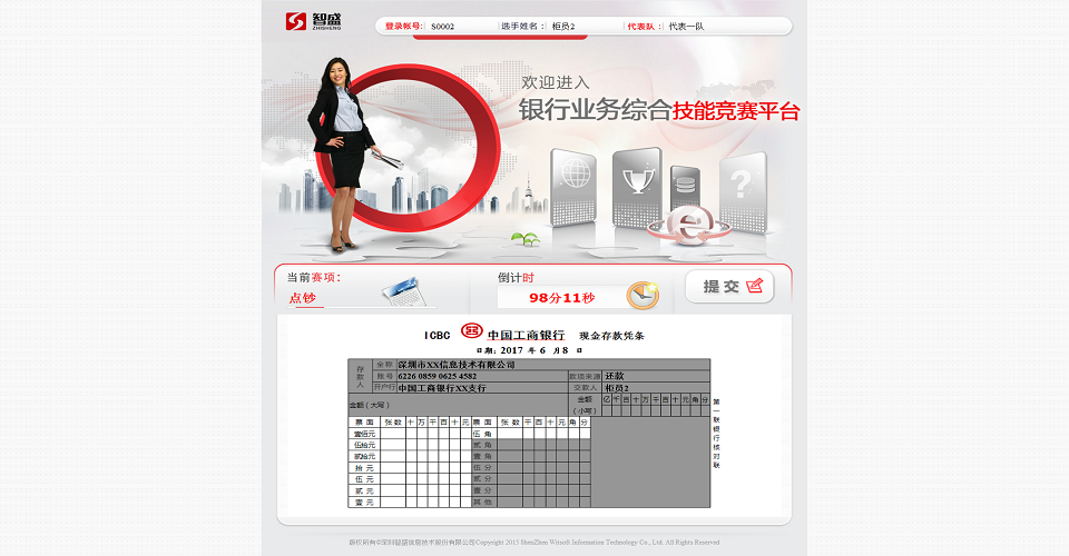 智盛商业银行综合业务技能竞赛平台软件,主要包括柜面业务技能,银行知识竞赛,手工点钞技能,翻打传票技能,字符录入技能,货币识假竞赛平台,所有竞赛任务符合最新银行业务规范及操作流程,涵盖了商业银行综合柜台业务所有业务。学校用该平台用于金融教学,使学生可以掌握银行从业人员应具备的基本技能,熟悉银行综合业务流程及操作规范,同时通过参加银行技能大赛,加深银行业务知识的理解,提高专业实际应用能力。