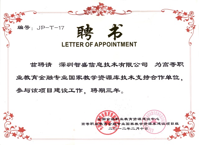 【金融资源库项目组颁发给深圳市智盛信息技术有限公司的聘书】